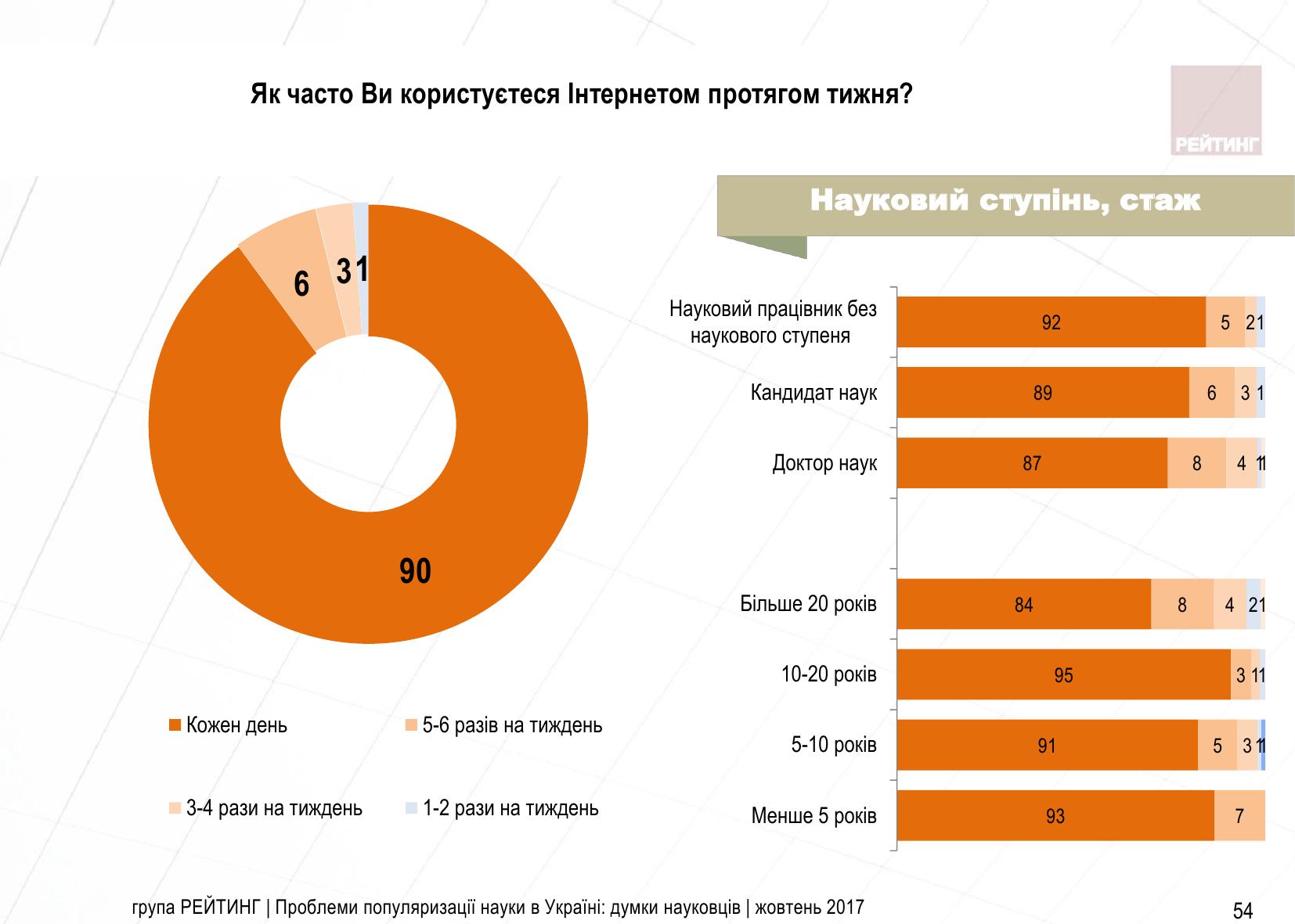 Абсолютное большинство украинских ученых (90%) пользуются интернетом ежедневно, 6% – по 3-4 раза в неделю, 3% – 5-6 раз в неделю, свидетельствуют данные опроса Социологической группы "Рейтинг".