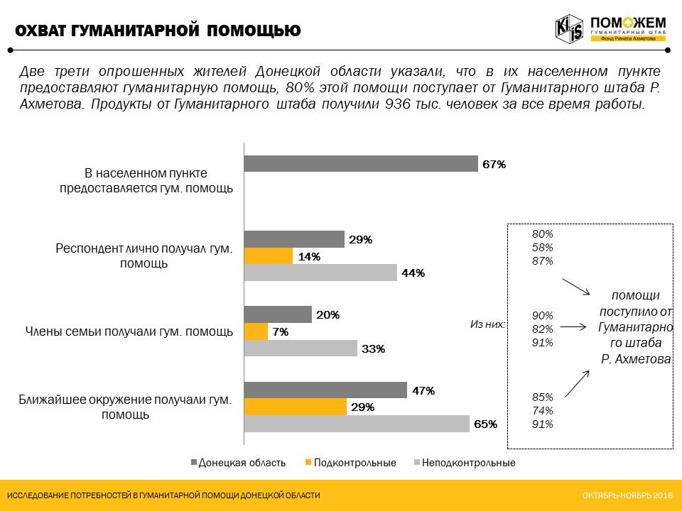Две трети опрошенных жителей Донецкой области по обе стороны линии разграничения указали, что в их населенном пункте предоставляется гуманитарная помощь. Каждый третий получал ее лично. Об этом свидетельствуют результаты социологического исследования, которое провел Киевский международный институт социологии (КМИС) в октябре-ноябре 2016 года по заказу Гуманитарного штаба Рината Ахметова.