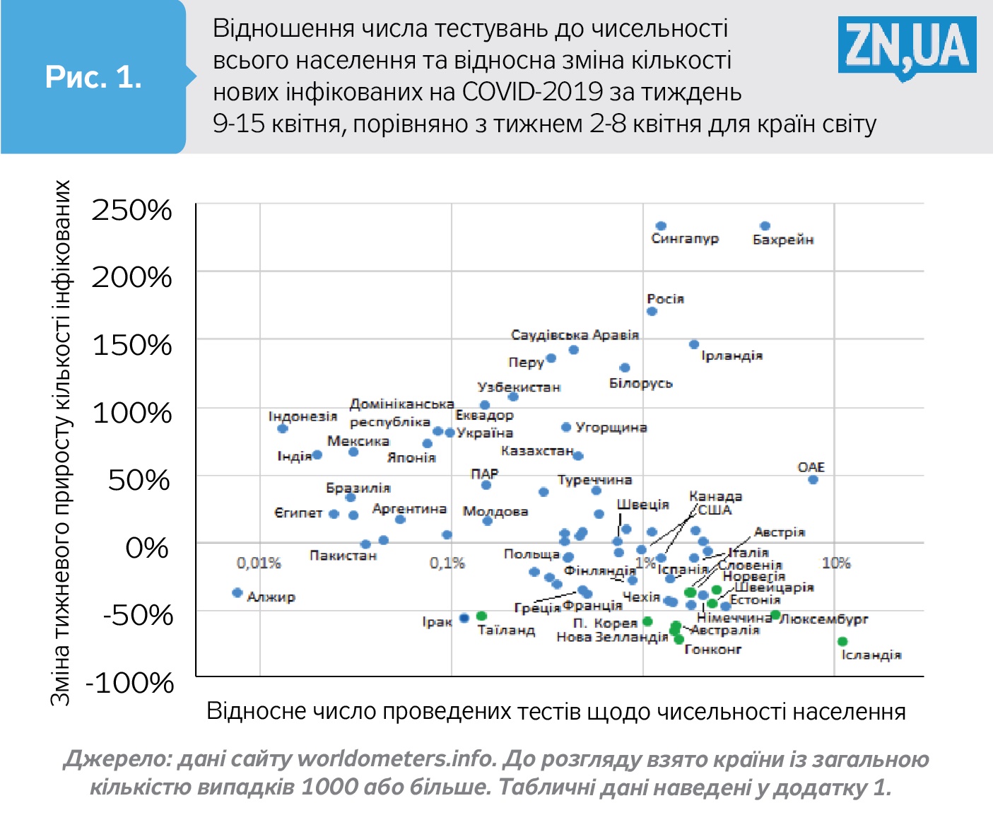 "Уровень 15% примерно отвечает ситуации, когда пик заболеваемости в целом остается позади. Страны, в которых за неделю 9–15 апреля количество всех зафиксированных случаев инфицирования выросло менее чем на 15%, обозначены зелеными маркерами. В этих странах уменьшение недельного количества новых случаев заболевания наблюдается, как правило, уже относительно долго", - объясняет Иванов.