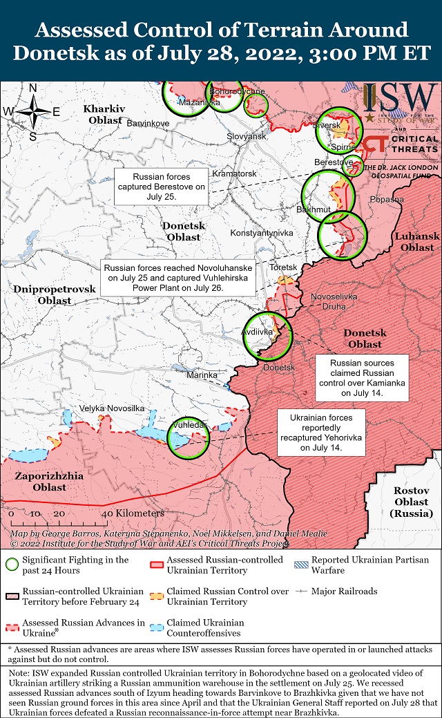 Российские оккупанты несколько продвинулись в направлении Бахмута и ради его взятия берегут силы под Северском. Однако эксперты американского Института изучения войны (ISW) сомневаются, что россиянам хватит сил для взятия Бахмута. Такое мнение они высказали в своем обзоре и 28 июля.