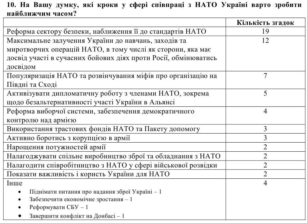 В ближайшее время Украине в сфере сотрудничества с НАТО нужно сосредоточиться на реформе сектора безопасности, приближения ее к стандартам Альянса, на максимальном вовлечении Украины в учения, мероприятия и миротворческие операции НАТО, в том числе как стороны, которая имеет опыт участия в современных боевых действиях против России, и популяризации НАТО и развенчании мифов об организации на Юге и Востоке Украины.