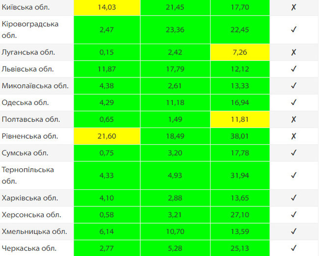 - инцидентность (количество новых случаев COVID-19 за последние 7 дней на 100 тысяч населения) составляет менее 12 на 100 тысяч населения (недельный уровень заболеваемости на 100 тысяч населения в период условного пика эпидемии по Украине +50%);
