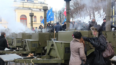 Ночью на Европейскую площадь также привезли с десяток полевых кухонь - чтобы готовить еду и чая для сторонников власти.