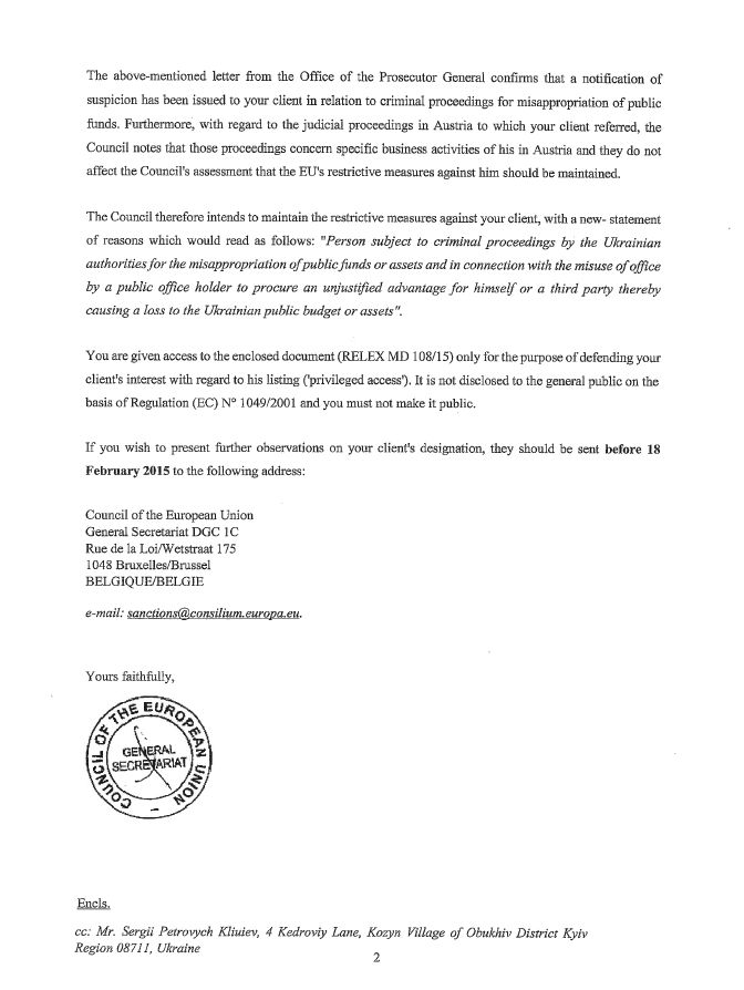 В письме говорится о том, что Совет ЕС намерен оставить в действии санкции в отношении Сергея Клюева с формулировкой о незаконном присвоении государственных средств и использовании служебного положения с целью получения неправомерной выгоды для себя или третьих лиц, сообщает РБК-Украина.