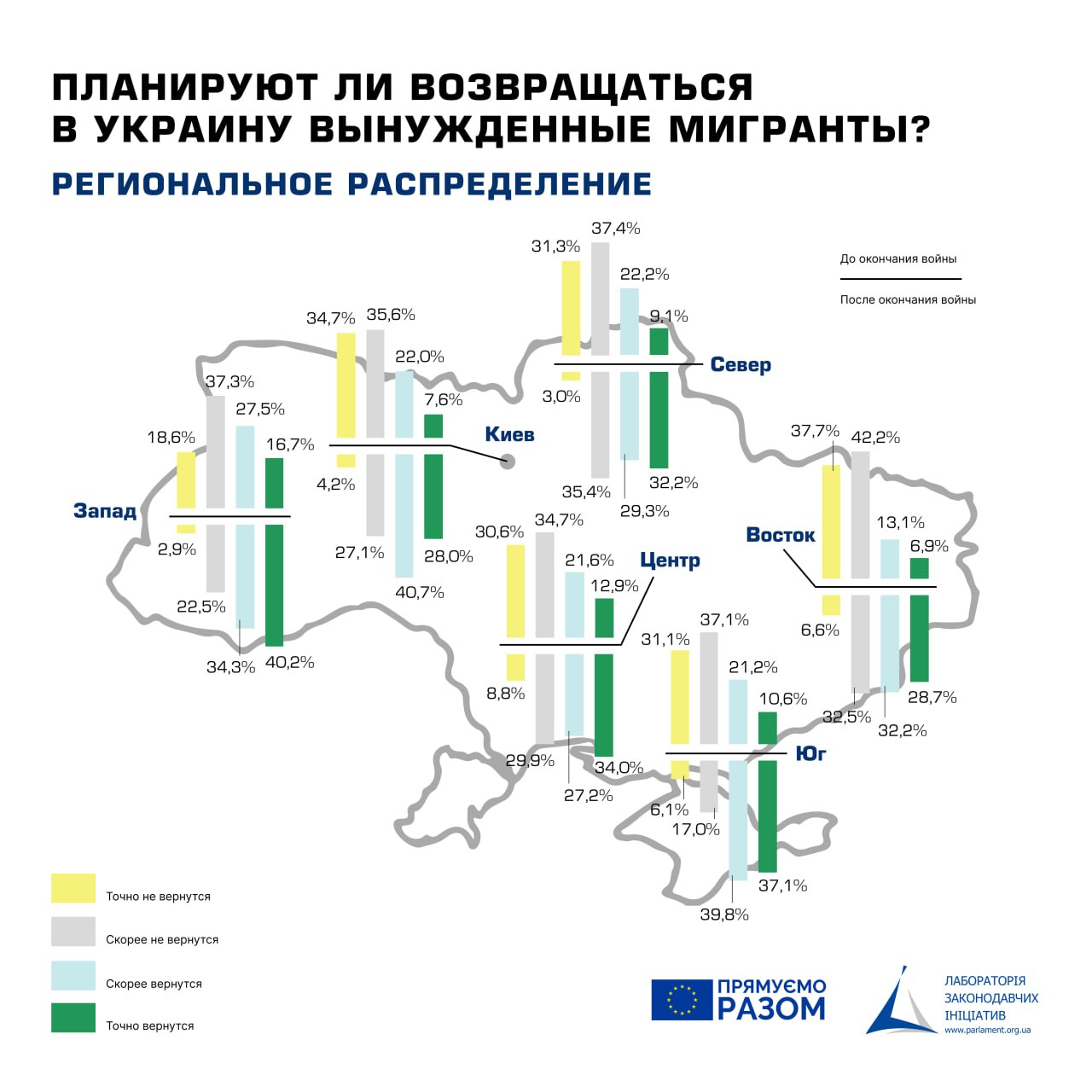 Проблема массового выезда за границу могла бы быть все же меньшей. Исследование показало, что 38% вынужденных мигрантов рассматривали вариант остаться в Украине в более безопасных регионах. Если считать от 6 миллионов вынужденных мигрантов, то около 2,3 миллиона могли бы остаться в Украине, став (хотя бы на некоторое время) ВПЛ.