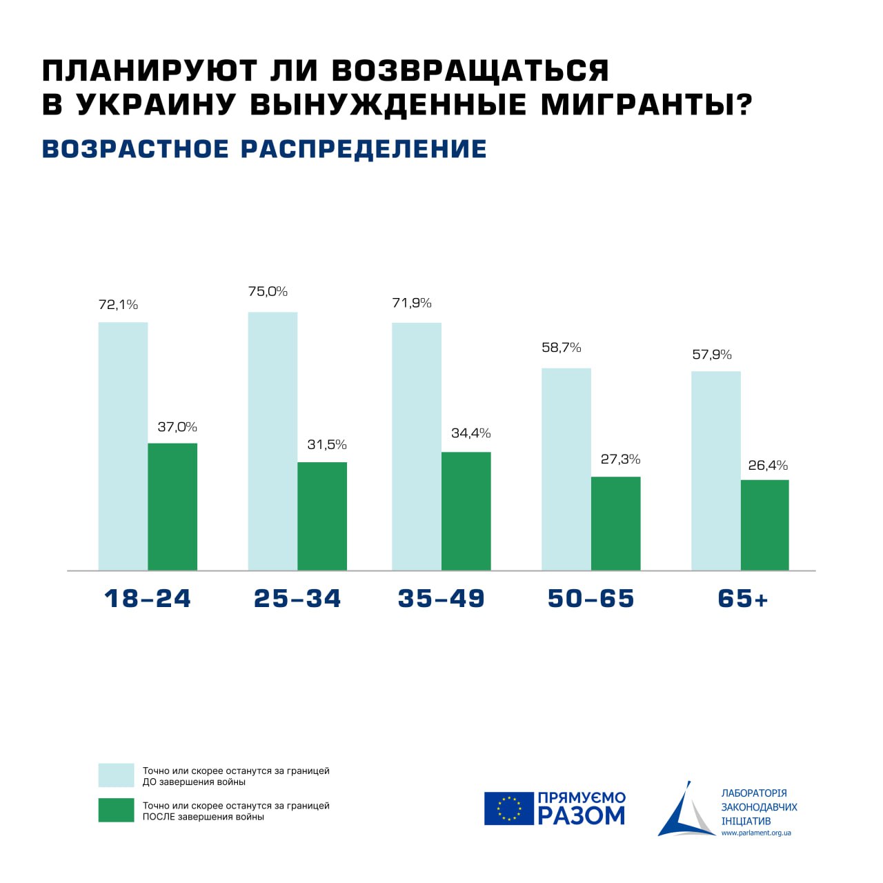 После окончания войны ситуация лучше — 68% респондентов поставили более 50 баллов, средняя оценка составляет 66 баллов. Так что тут соотношение наоборот — две трети вынужденных мигрантов планируют вернуться в Украину после завершения войны.