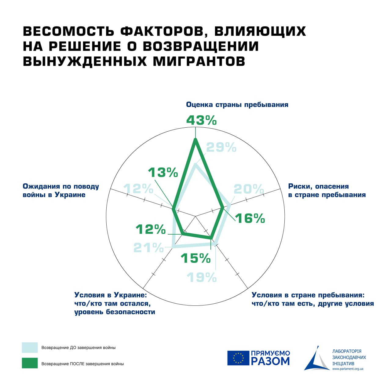 Самой существенной оказалась группа факторов, касающихся оценки страны пребывания, то есть то, насколько вынужденные мигранты удовлетворены качеством жизни в стране пребывания, начиная с сугубо практических вопросов (например, качества образования, медицины, возможности трудоустроиться, сферы услуг, качества инфраструктуры и т.п.) и заканчивая более общими (например, близостью менталитета населения страны пребывания). Именно эта группа факторов определяет 29% решения о возвращении до завершения войны и 43% — после завершения (если представить решение о возвращении как 100%). Другие же группы колеблются в пределах 12–21%. Более того, самая важная причина, которая уменьшает желание возвращаться, — это ожидание низкого качества жизни в Украине. 60% респондентов указали эту причину.