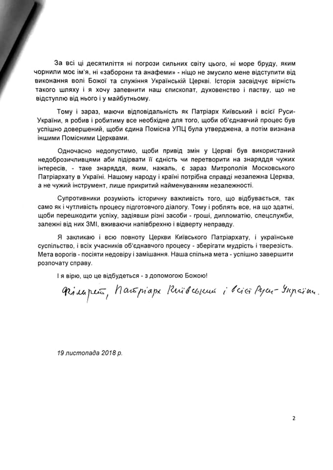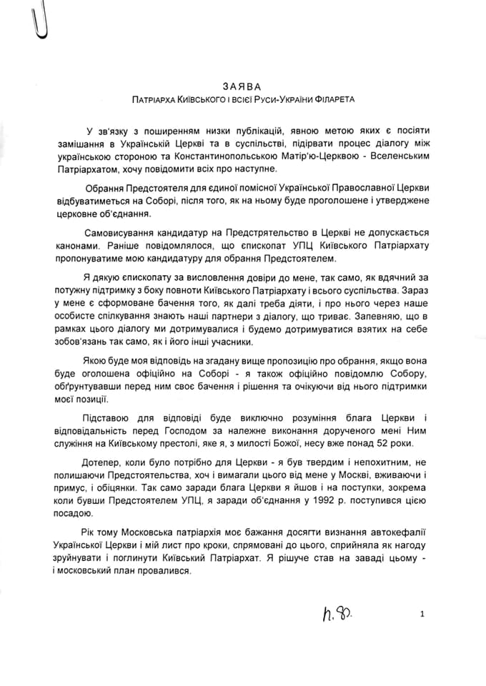"Ранее сообщалось, что епископат УПЦ Киевского Патриархата будет предлагать мою кандидатуру для избрания Предстоятелем. Я благодарю епископат за выражение доверия ко мне, так же, как благодарен за мощную поддержку со стороны полноты Киевского Патриархата и всего общества. ... Какой будет мой ответ на упомянутое выше предложение об избрании, если оно будет объявлено официально на Соборе - я официально сообщу во время Собора, обосновав перед ним свое видение и решение и ожидая от него поддержки моей позиции", - сообщил Филарет в Facebook.