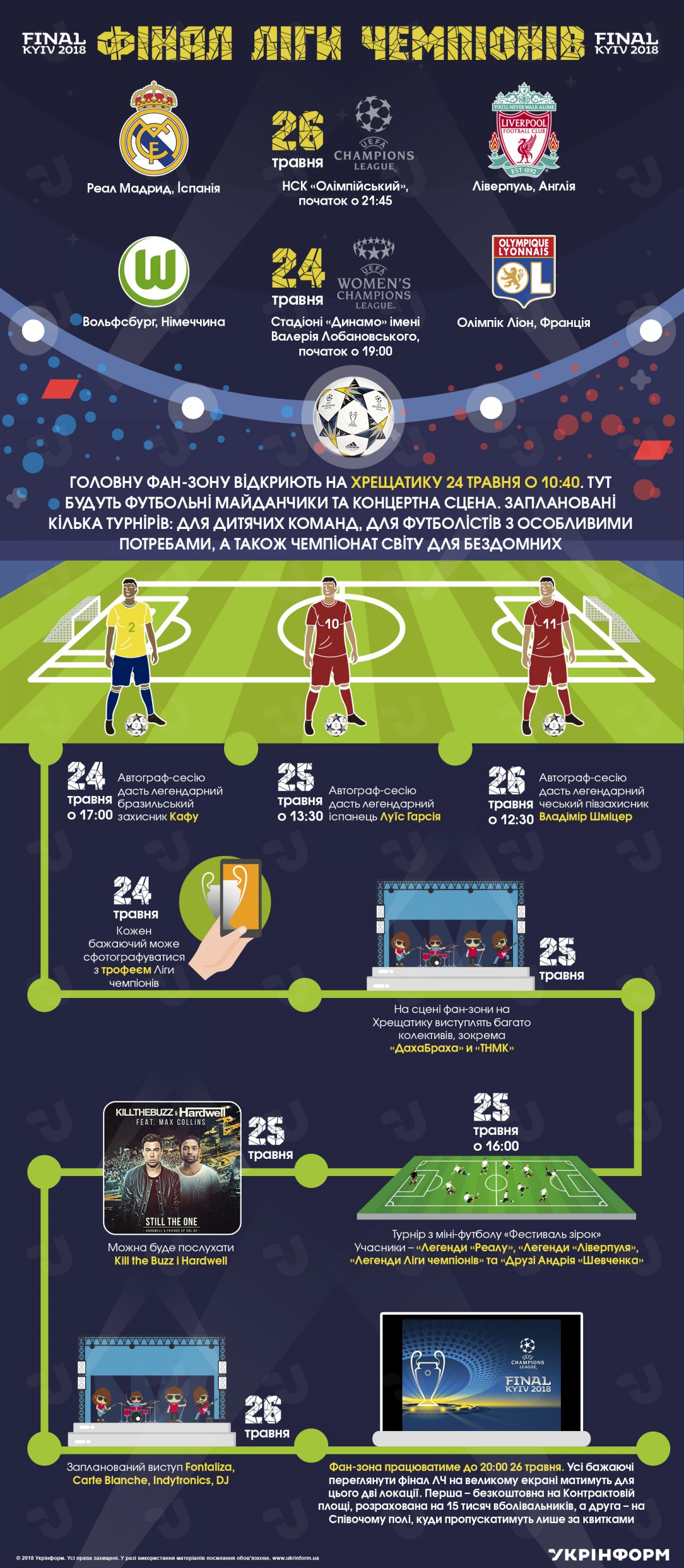 24 мая каждый желающий может сфотографироваться с трофеем Лиги чемпионов, а в 17:00 легендарный бразильский защитник Кафу даст автогрф-сессию. 24 мая на сцене фан-зоны на Крещатике выступят музыкальные коллективы.