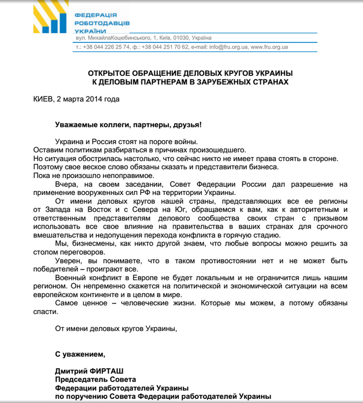 "От имени деловых кругов нашей страны, представляющих все ее регионы... обращаемся к вам как к авторитетным и ответственным представителям делового сообщества России с призывом употребить все свое влияние для недопущения перехода конфликта в горячую стадию", - отмечается в послании украинских бизнесменов.