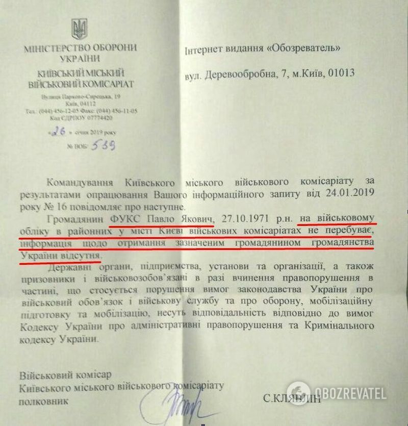 "Гражданин Фукс Павел Яковлевич, 27.10.1971 г. р., на воинском учете в районных в г. Киев военных комиссариатах не числится, информация о получении данным гражданином гражданства Украины отсутствует", - говорится в ответе Киевского городского военного комиссариата на информационный запрос издания.