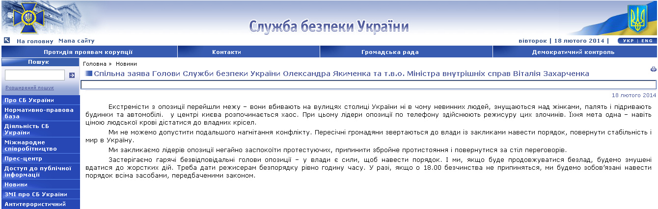 Главы СБУ Александр Якименко и МВД Виталий Захарченко призвали немедленно прекратить вооруженное противостояние в центре Киева и вернуться за стол переговоров. Если через два часа беспорядок не прекратится, СБУ и МВД "вынуждены будут прибегнуть к жестким действиям".
