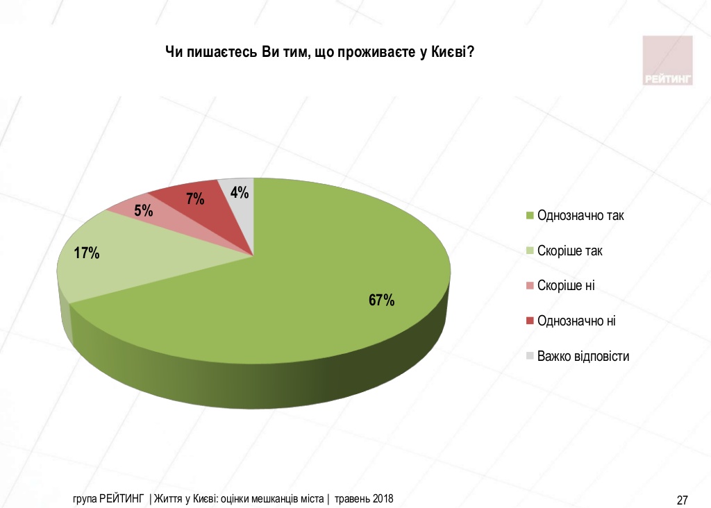 Гордятся своим городом 84% киевлян, противоположных взглядов придерживаются 12% жителей столицы, свидетельствуют данные опроса Социологической группы "Рейтинг". Основной причиной гордости называли историю Киева (65%).