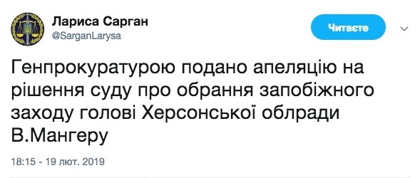 "Генпрокуратура подала апелляцию на решение суда об избрании меры пресечения председателю Херсонского облсовета В. Мангеру", - написала Сарган.