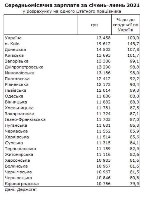 Наименьший показатель в Кировоградской области - 10 756 гривен (79,9%) и в Черновицкой области - 10 846 гривен (80,6 %) от средней зарплаты по стране.