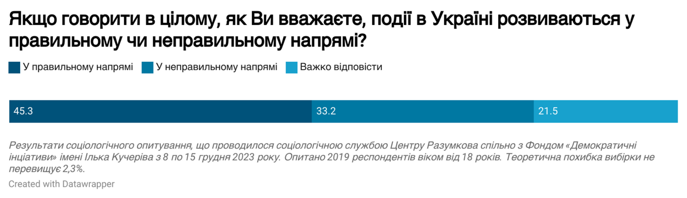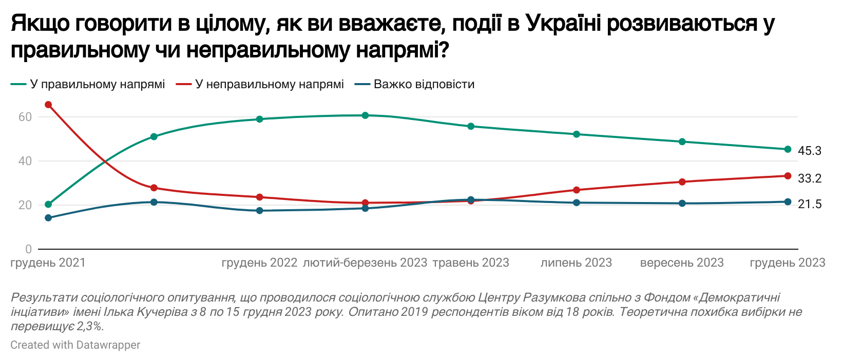 После начала полномасштабной агрессии России против Украины доля граждан, считающих, что события в Украине развиваются в правильном направлении, существенно возросла (с 20% в декабре 2021 года до 51% в сентябре-октябре 2022 года, достигнув самых высоких показателей в феврале-марте 2023 года) года (61%), после чего наблюдается тенденция снижения этого показателя (до 45% по данным последнего опроса), 33% респондентов считают, что события развиваются в неправильном направлении, а 21,5% не определились.