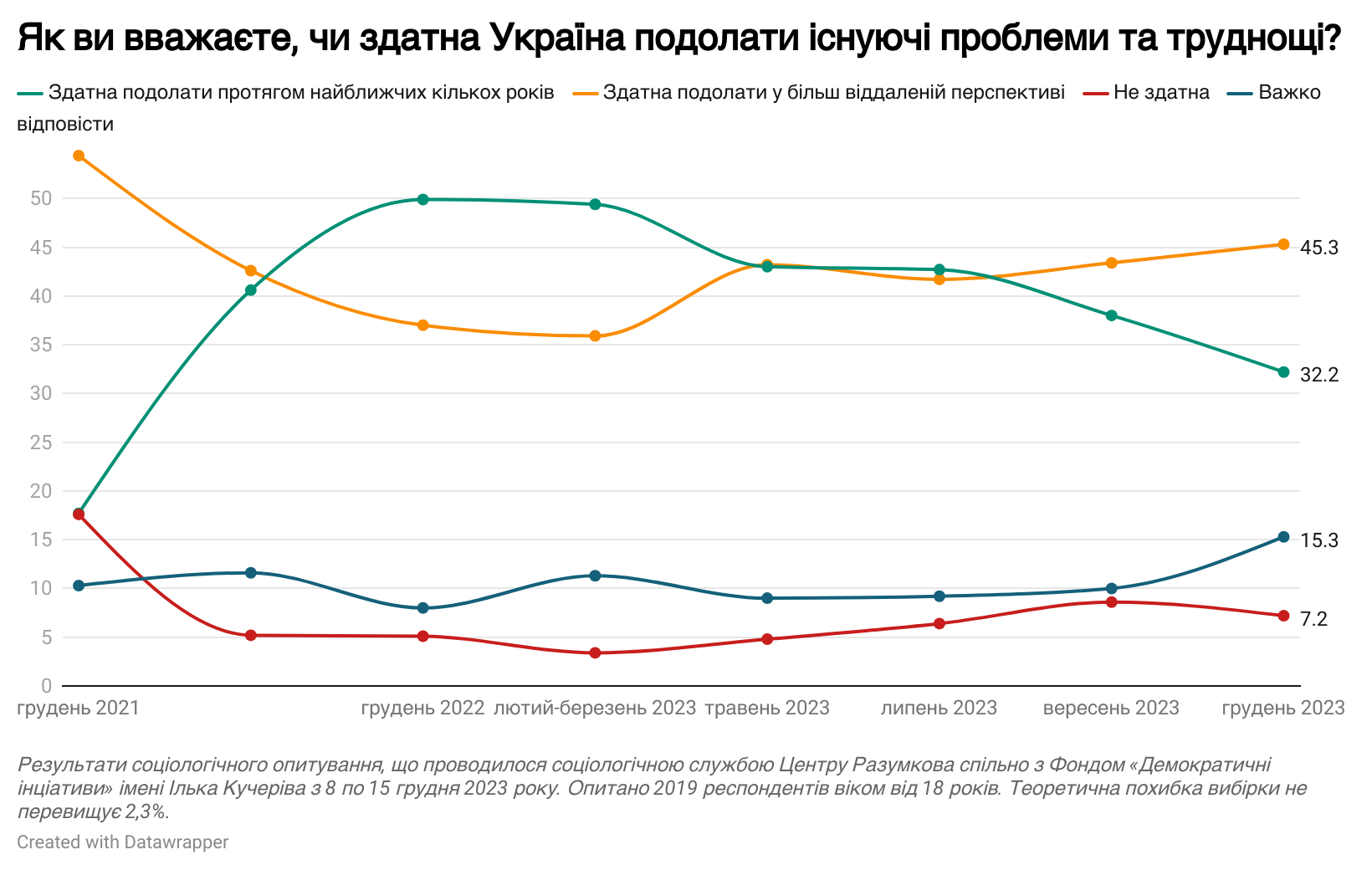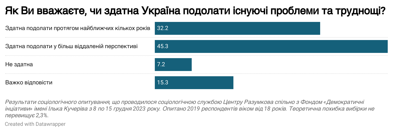 32% украинцев считают, что Украина способна преодолеть существующие проблемы и трудности в ближайшие несколько лет, 45% считают, что Украина сможет преодолеть проблемы в более отдаленной перспективе, и 7% – что Украина не способна преодолеть существующие проблемы (остальные – не определились).