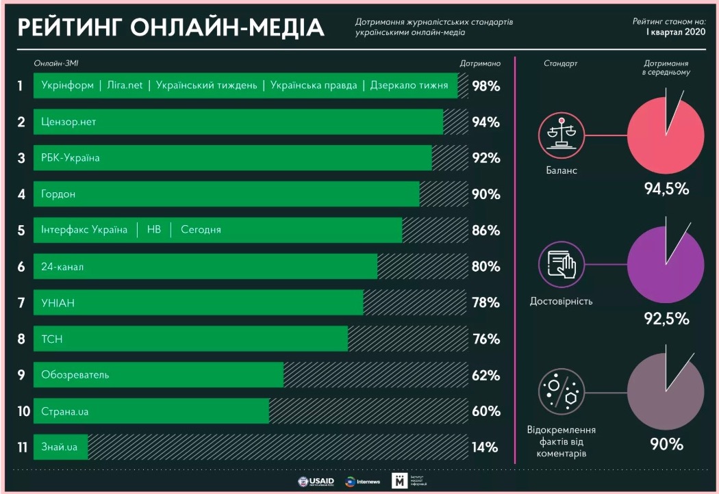 Второе место в этом рейтинге впервые заняло издание "Цензор" – 94% материалов не содержали нарушений, в тройку также вошло издание "РБК-Украина".