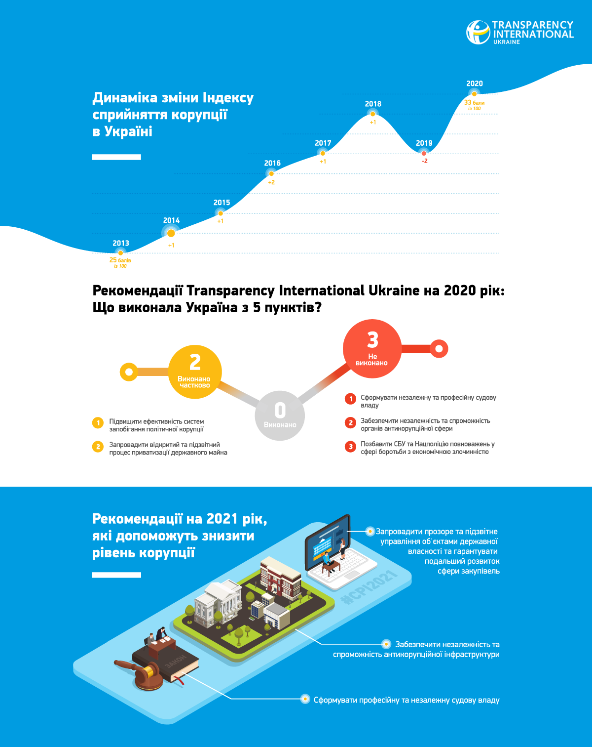 Как отмечают в ТI Украины, в начале 2020 году стране было оказано пять рекомендаций, которые помогли бы снизить уровень коррупции в Украине. Однако, по словам экспертов, ни одна из них не была выполнена полностью, две были выполнены частично, а три не выполнены вообще.