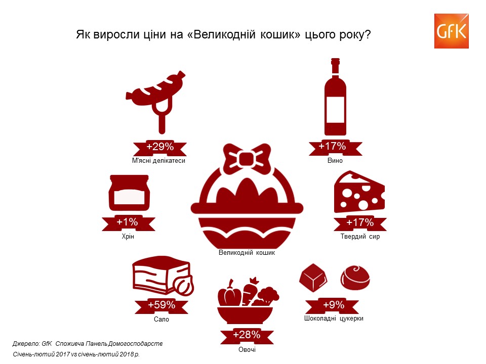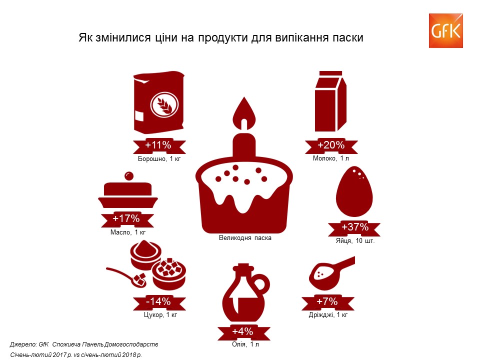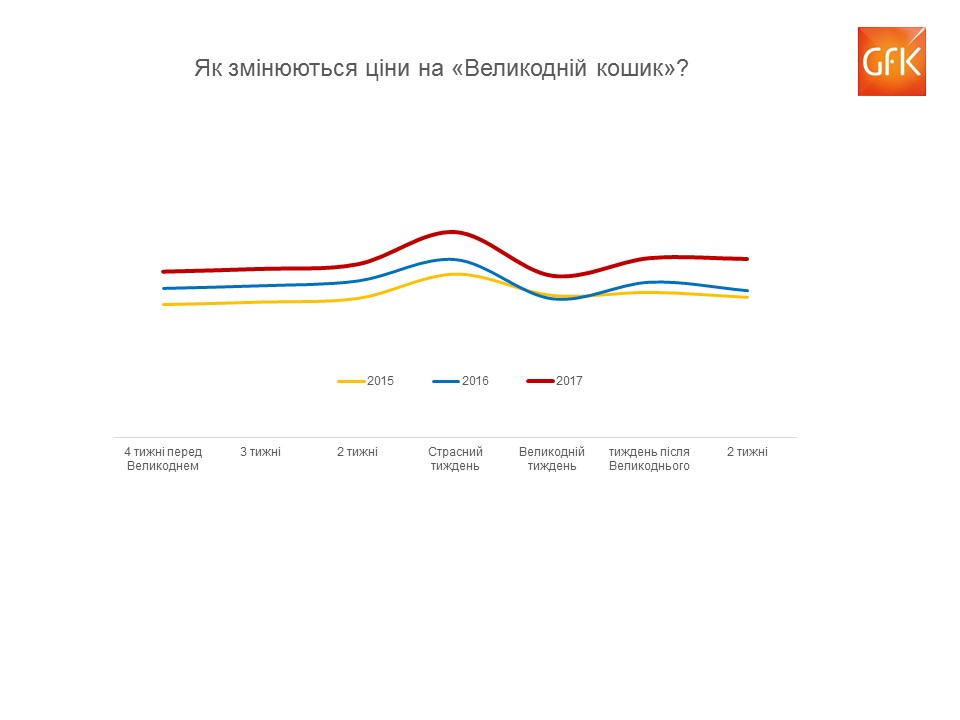 Как показывают многолетние наблюдения потребительской панели домохозяйств GfK Ukraine, накануне Пасхи цены резко растут. Так, в 2017 году в течение Страстной недели цены поднялись в среднем на 19%.