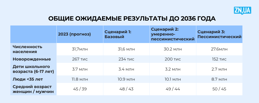 Рассматриваются три возможных сценария изменения численности населения к 2036 году: базовый, умеренно-пессимистический и пессимистический. Так, по базовому сценарию к 2036 году численность населения Украины составит 31,6 миллиона человек (по оценкам, в 2023 году она составила 31,7 миллиона). По умеренно-пессимистичному, численность населения нашей страны сократится до 30,2 миллиона, а по пессимистическому – до 27,6 миллиона.