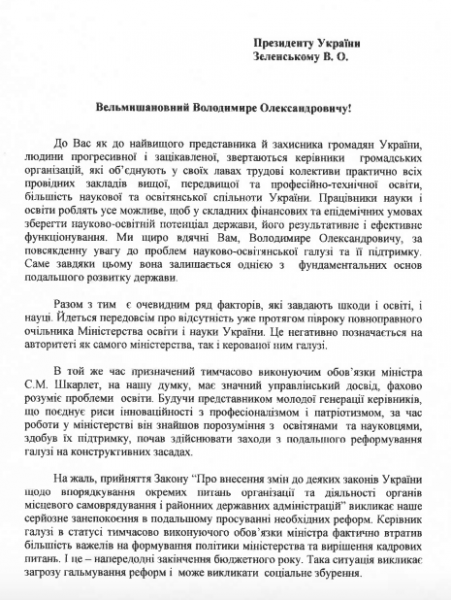 Представители образовательных организаций и профсоюзов, ранее уличенные в плагиате, направили президенту Владимиру Зеленскому письмо, в котором просят содействовать скорейшему назначению министром образования и науки Сергея Шкарлета, исполняющего роль и.о.