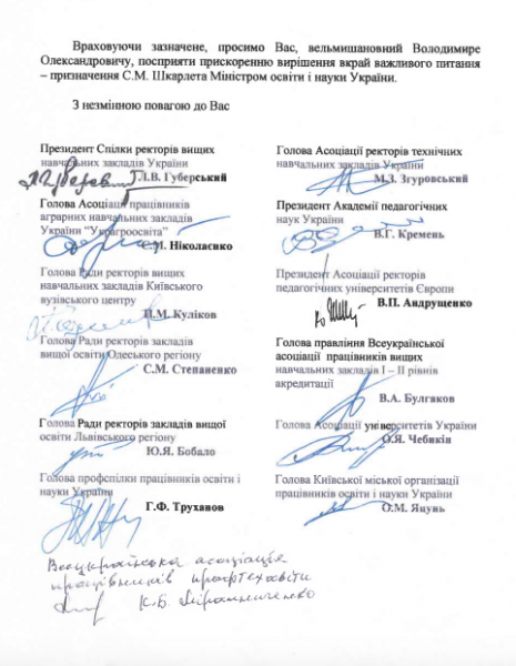 Среди подписантов письма - глава Союза ректоров высших учебных заведений Украины Леонид Губерский, глава Ассоциации ректоров технических учебных заведений Украины Михаил Згуровский, глава Ассоциации работников аграрных учебных заведений Украины «Украгроосвита» Станислав Николаенко и другие.