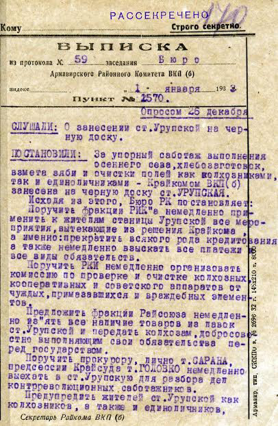 "А) выселить в кратчайшие сроки в северные районы СССР из станицы Полтавской (Северный Кавказ), как наиболее контрреволюционной, всех жителей, за исключением действительно верных советской власти и не задействованных в саботаже хлебозаготовок колхозников и единоличников и заселить эту станицу добросовестными колхозниками-красноармейцами, которые работают в условиях малоземелья и на неудобных землях в других краях, передав им всю землю и озимые посевы, строения, инвентарь и скот выселяемых...