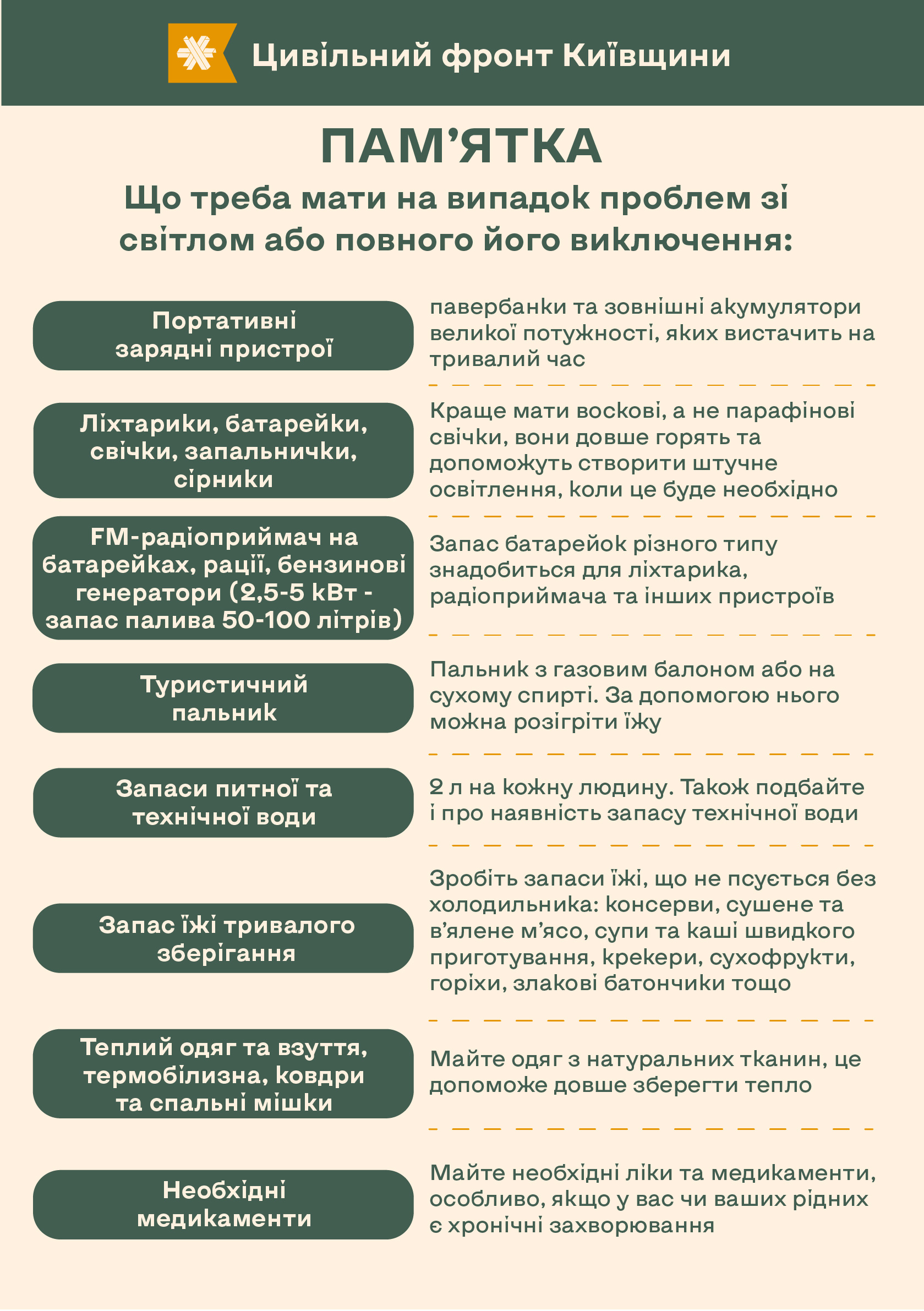 В Киевской областной военной администрации напомнили, что следует подготовить заранее перед длительными отключениями света.