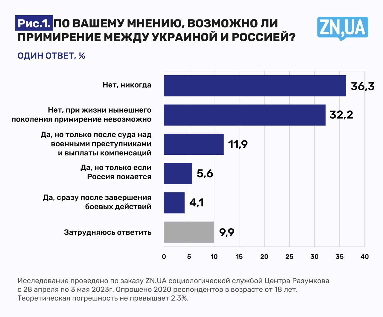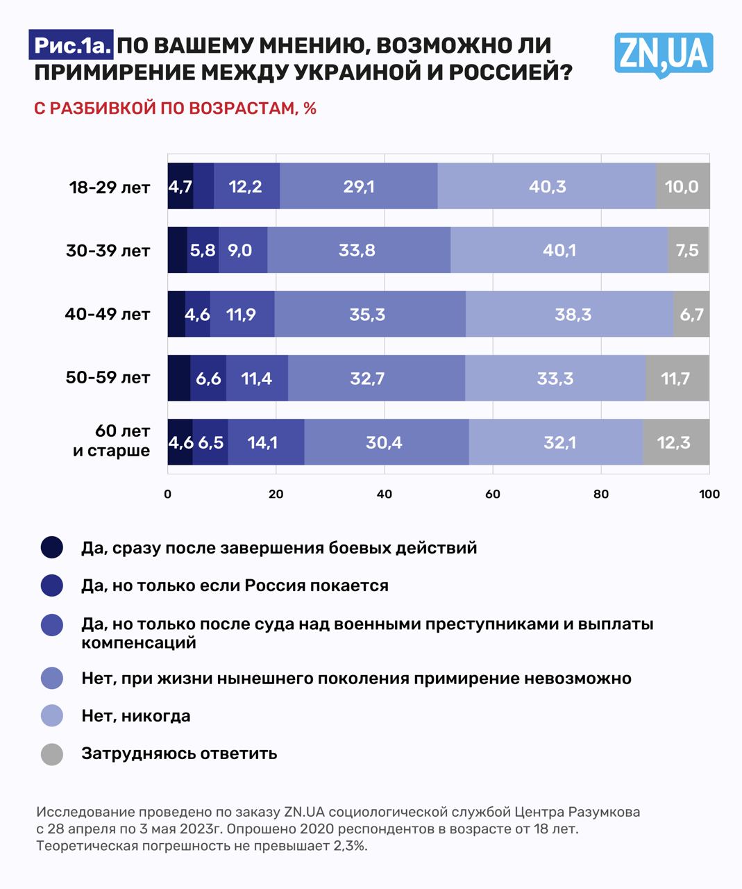 Однако в Украине остается 21,6% оптимистично настроенных граждан, которые все же видят возможность такого примирения. Так, 11,9% опрошенных не возлагают ответственность за военные преступления российской власти, совершенные в Украине, на весь российский народ. Поэтому считают, что примирение возможно «после суда над российскими военными преступниками и выплаты компенсаций». 5,6% украинцев верят в великую силу раскаяния, поэтому примирения ждут, «только если Россия покается». Процент же тех, кто верит, что можно дважды войти в одну и ту же реку, надеется, что все вернется, как было раньше, и выбрал ответ «Сразу после завершения боевых действий», оказался даже меньше (4,1%) доли респондентов, которые не определились и выбрали вариант «Трудно ответить» (9,9%).