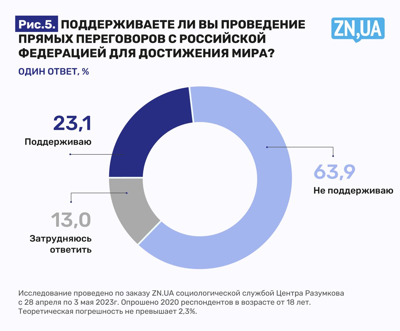 Человечность стала опорой, которая помогла сохранить личностную и национальную идентичность, создать горизонтальные связи и верить в победу, а не в «перемирие любой ценой». Поэтому на вопрос «Поддерживаете ли вы проведение прямых переговоров с Российской Федерацией для достижения мира?» большинство украинцев (63,9%) ответили отказом. 13% респондентов было «трудно ответить» на этот вопрос. Лишь 23,1% респондентов выказали готовность поддержать проведение прямых переговоров с Россией для достижения мира (см. рис. 5).