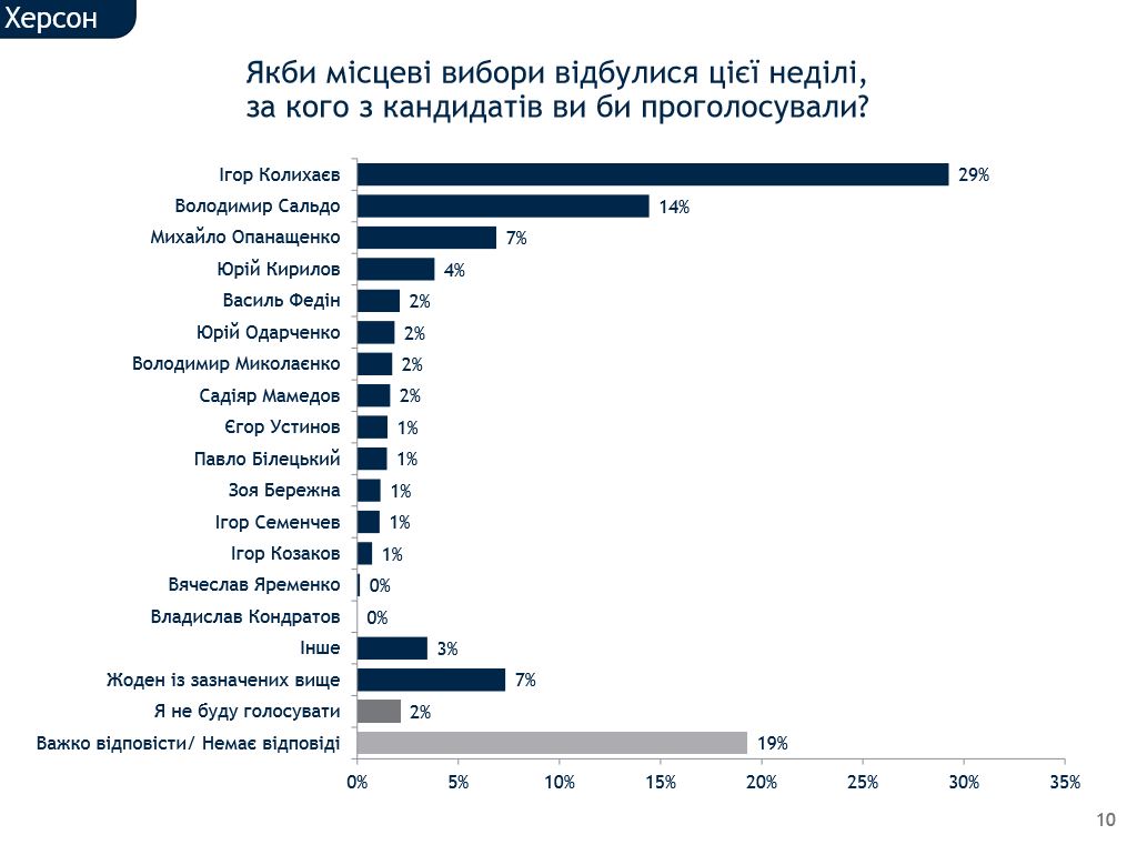Действующий мэр Владимир Миколаенко не баллотируется на предстоящих 25 октября местных выборах, а значит основная борьба будет проходить между Игорем Колыхаевым (у которого сейчас 37% поддержки местных жителей) и Владимиром Сальдо (экс-мэром с 18% симпатий горожан). Очевидно эти два кандидата пройдут во второй тур.