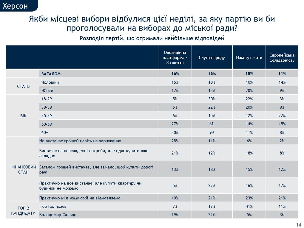 Опрос показывает, что если бы выборы состоялись в ближайшее время, то наибольшую поддержку жителей Херсона получила бы ОПЗЖ – 16%. Такие же цифры у партии президента Украины Зеленского "Слуга народа". С минимальным отрывом в 1% от них идет партия Колыхаева, а немного отставая "Европейская солидарность" с 11% поддержки.