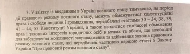 Согласно пункту третьему этого указа, могут быть ограничены конституционные права и свободы человека и гражданина, предусмотренные статьями 30-34, 38, 39, 41-44, 53 Конституции Украины, а также вводятся временные ограничения прав и законных интересов юридических лиц в рамках и объемах, которые необходимы для обеспечения возможности введения и осуществления мер правового режима военного положения , которые предусмотрены частью первой статьи 8 Закона Украины "О правовом режиме военного положения".