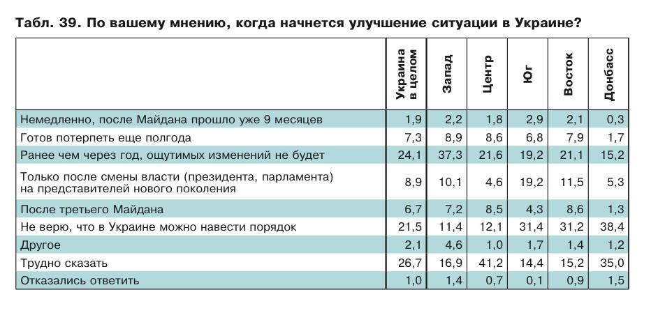 Только 2% граждан убеждены в том, что изменения к лучшему должны наступить немедленно, потому что после Майдана прошло уже десять месяцев и ждать больше нельзя. Пик подобной уверенности пришелся на Херсон, где 5,3% жителей области поддержали данный тезис. Однако с ними абсолютно не согласны жители Луганской и Николаевской области (0%).