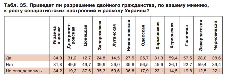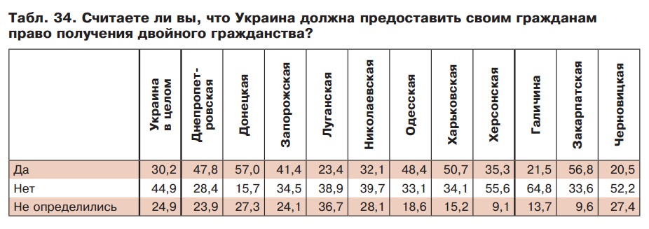 В действительности желающих узаконить бипатридов как класс в Украине немало - 30,2% в целом по стране. 47,3% - на Востоке, 45,3% - в Донбассе, 41% - на Юге. 50,7% жаждут двойного гражданства в одной только Харьковской области.