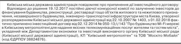 Киевская городская государственная администрация расторгла инвестиционный договор с ООО "Москито Мобайл" о строительстве сети Wi-Fi в киевском метрополитене, заключенный в декабре 2014 года. Соответствующее объявление размещено в столичной газете "Хрещатик".