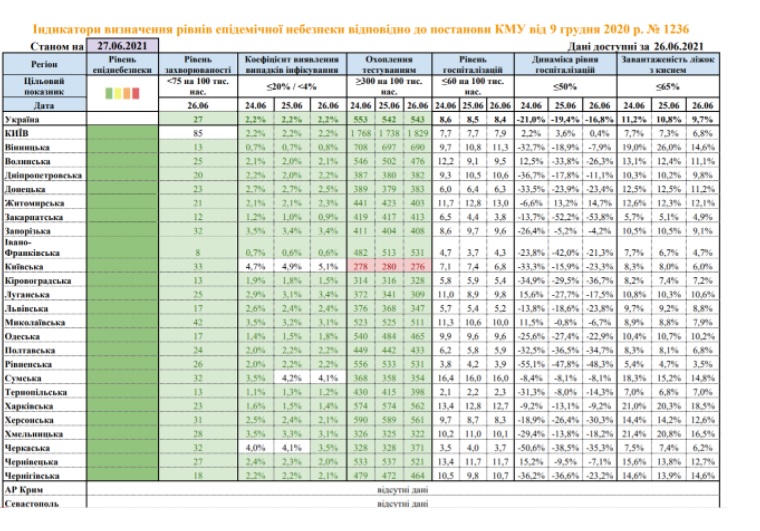 По состоянию на воскресенье, 27 июня, Киевская и остальные области Украины находятся в "зеленой" зоне карантина. Однако в Киевской области уже третий день подряд наблюдается "красный" уровень по показателю охвата тестирования на коронавирус.