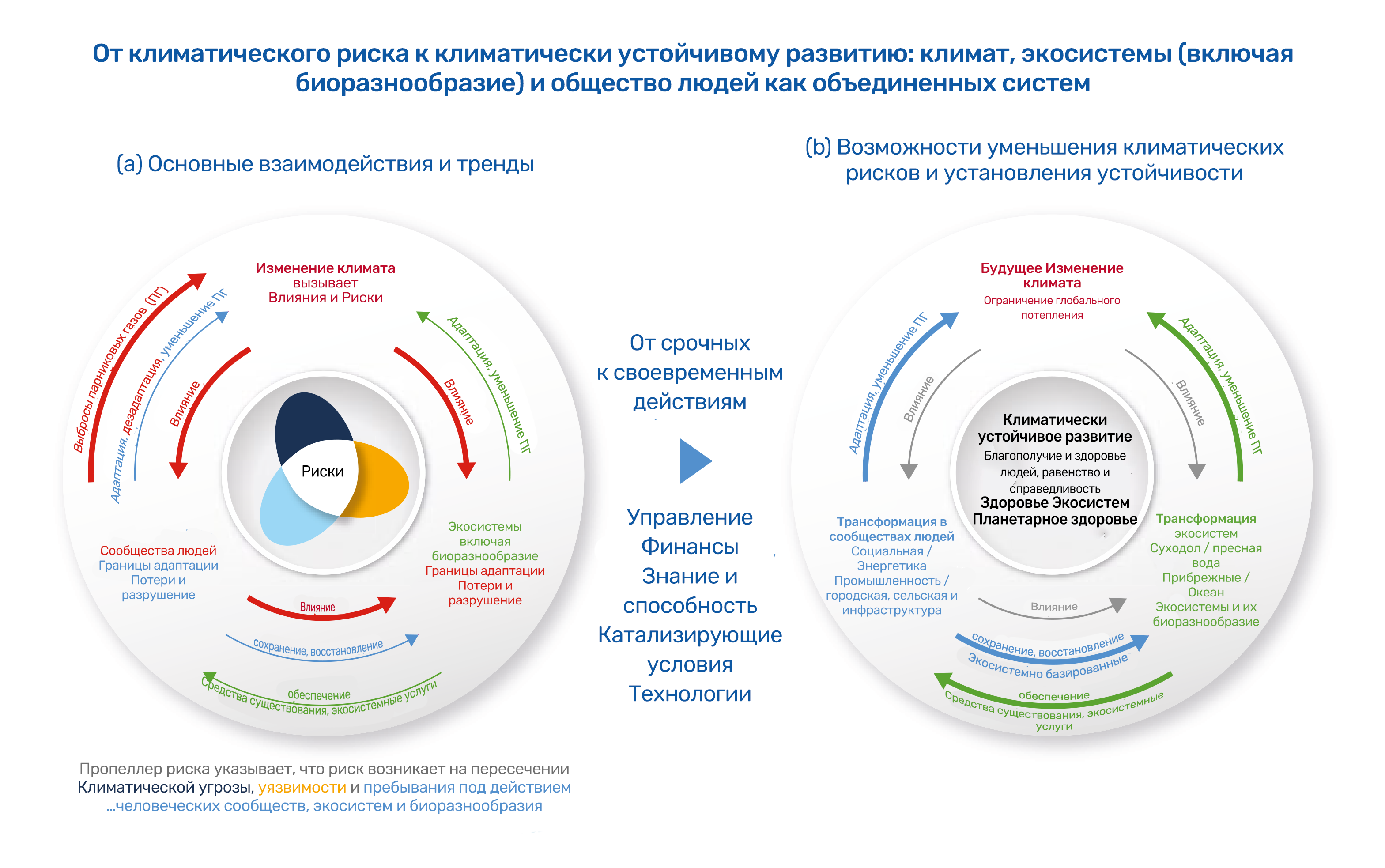 Все эти запросы общества отвечают климатически устойчивому развитию и переходу от реактивного к проактивному реагированию на климатические риски, как показано на рис. 2, где залогом такой трансформации являются управление, финансы, знания и потенциал, технологии и условия, при которых процессы трансформации будут ускоряться.