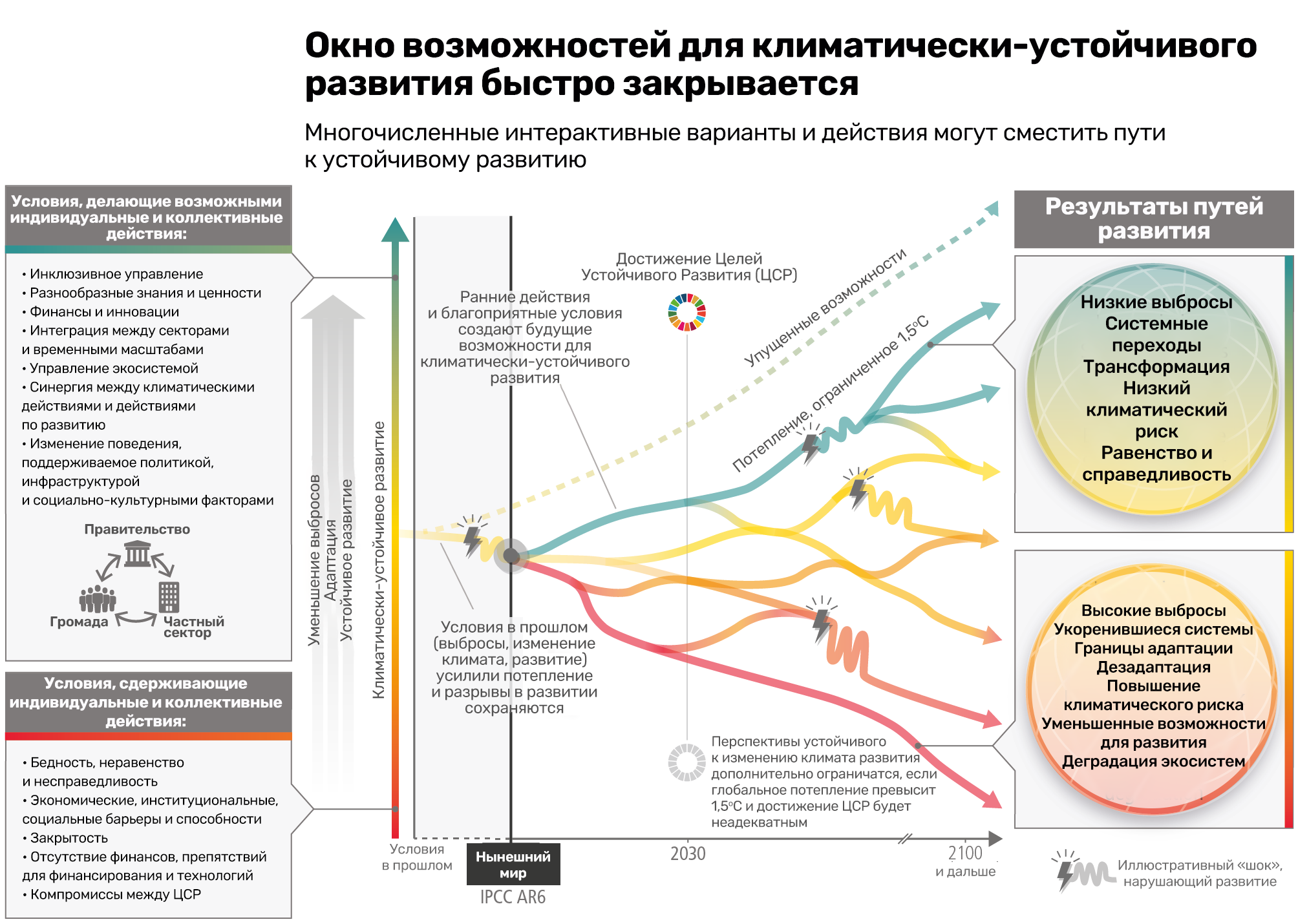 Самой известной и авторитетной организацией, анализирующей научные достижения в изменении климата, является Межправительственная группа экспертов по изменению климата (МГЭИК), которую в 1988 году основали два учреждения ООН: Всемирная метеорологическая организация (ВМО) и Всемирная программа охраны окружающей среды (ЮНЕП, UNEP—UnitedNationEnvironmentalProgram) по запросу правительств стран, хотевших знать, к чему готовиться и как предотвратить значительное влияние на климатическую систему. В последнем, уже шестом обобщающем отчете МГЭИК по оценке изменения климата, вышедшем в 2023 году, четко указано: «Окно возможностей для климатически устойчивого развития быстро закрывается» (см. рис. 1 (IPCC SYR.6)).