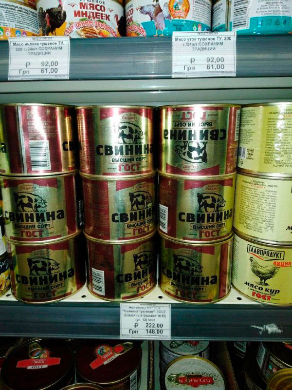 На полках магазина есть тушеная свинина – 148 грн за банку, консерва из индюка и утки – 61 грн за банку.