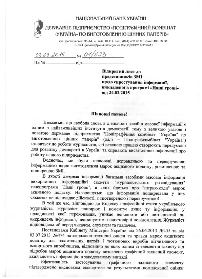 Работники комбината "Украина" считают неправдивой и искаженной информацией об изготовлении марок акцизного налога, размещенной и распространенной СМИ со ссылкой на программу "Наші гроші".