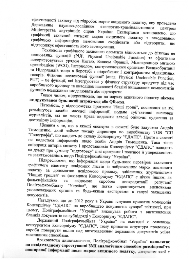 "Интересным фактом является то, что в качестве эксперта в сюжете был привлечен Андрей Тимошенко, который занимает должность директора по производству ООО "СП "Голография", которое входит в состав Консорциума "ЕДАПС". Однако в сюжете не уточняется информация о должности Андрея Тимошенко, - отмечается в заявлении. - Такое тесное сотрудничество авторов сюжета и представителей Консорциума "ЕДАПС" наводит на мысль о совместной "подготовке" этой программы и объясняет ее предвзятость и заангажированность в отношении Полиграфкомбината "Украина".