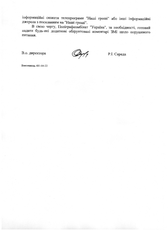 Работники комбината заявляют, что под видом проверки уровня защищенности специального графического элемента, журналисты "Наших грошей" и представители "ЕДАПС" прибегли к провокации, используя при этом неизвестный прибор: "Информация о любых проверках защитного графического элемента неизвестных листов с изображением марок акцизного налога с помощью неизвестного прибора, осуществленных журналистами "Наших грошей" и специалистами Консорциума "ЕДАПС" является ничем иным, как фальсификацией и сознательной попыткой дискредитации репутации Полиграфкомбината "Украина", легко опровергается выводами уполномоченных органов и любыми экспертами в области защищенных документов".