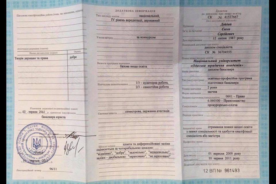 Между тем, как выяснило ZN.UA, народный депутат Евгений Дейдей ("Народный фронт") в 2011 году получил степень бакалавра в Одесской юридической академии.