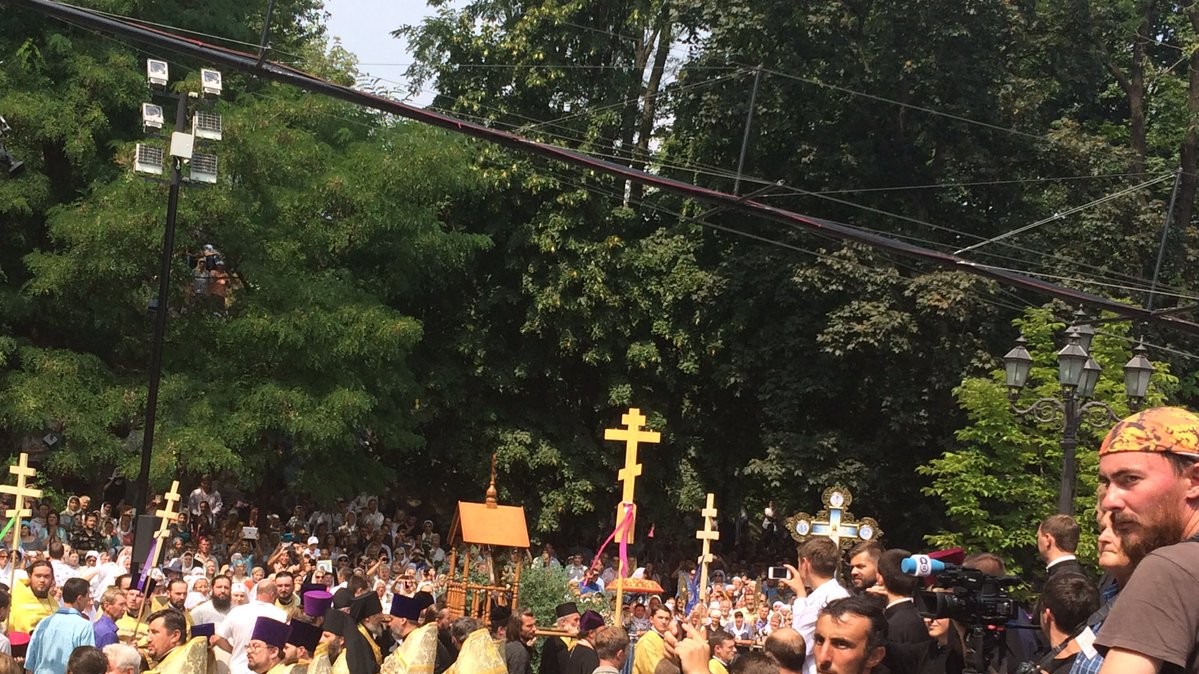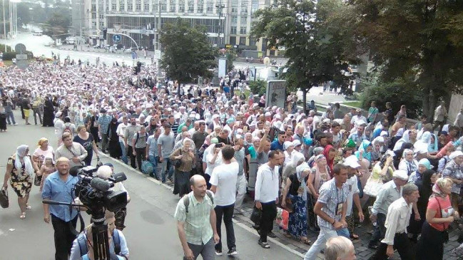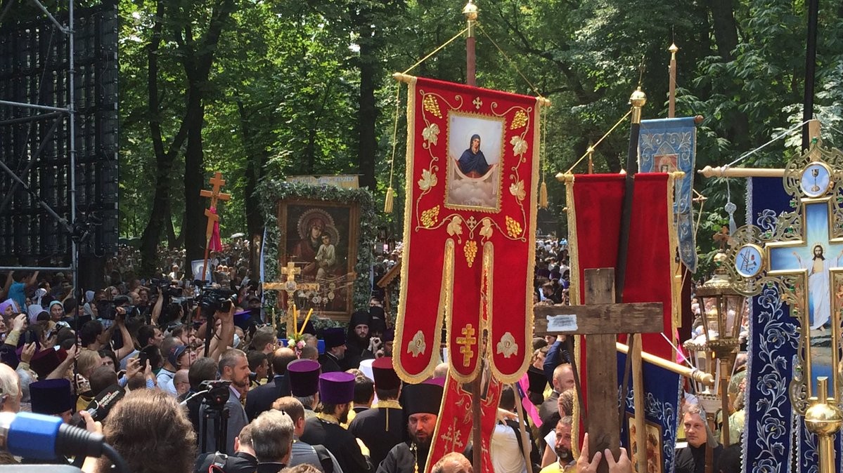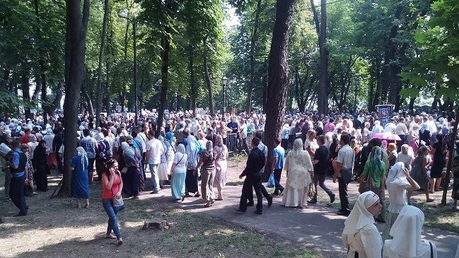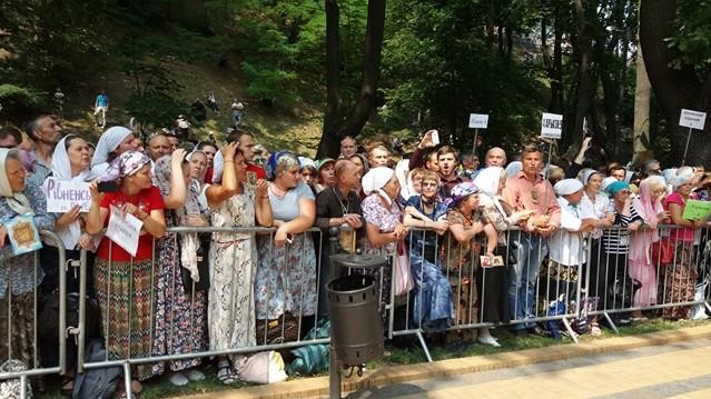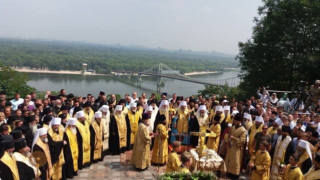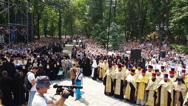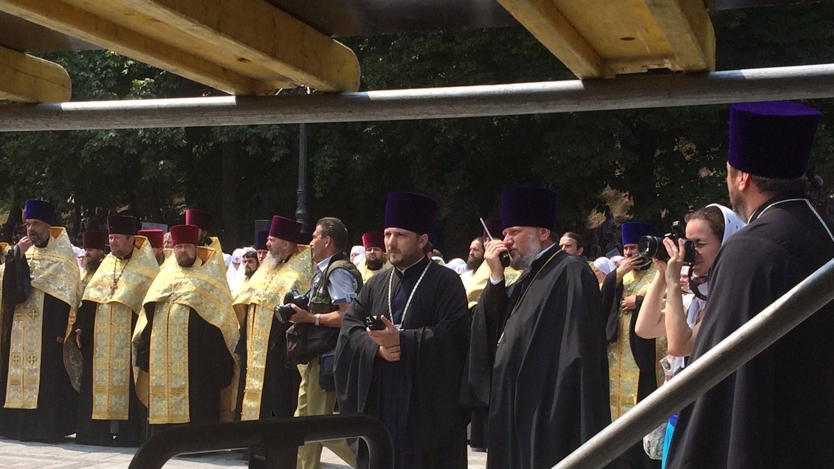 Молебен возле памятника св.Владимира на Владимирской горке в Киеве начался около 13:00 дня. К участию были допущены лишь верующие, пришедшие в колоннах крестного хода с Востока и Запада. Среди верующих замечены депутаты "Оппозиционного блока" Юрий Бойко, Вадим Новинский, Нестор Шуфрич, Евгений Геллер.