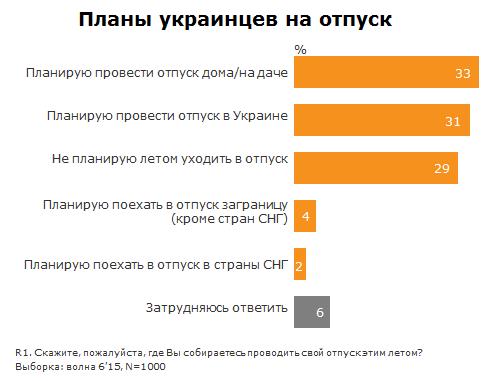 Данные исследования говорят о том, что 64% украинцев планируют провести отпуск в пределах Украины или на собственной даче. Всего 6% украинцев планируют выезжать за границу – 2% намерены провести отпуск в странах СНГ, 4% - выехать за границы СНГ.