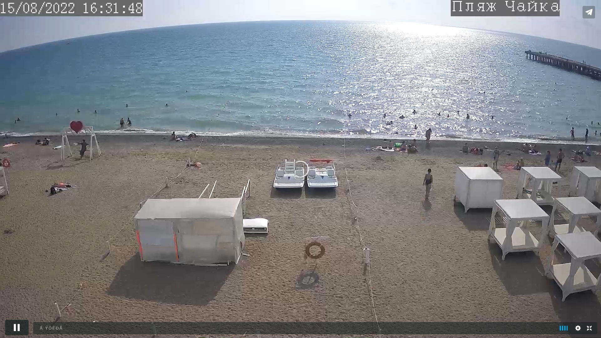 В разгар курортного сезона на пляже «Чайка» в Новофедоровке, людей меньше, чем в зимой. Пляж практически пустой. Редкие отдыхающие сидят у воды или купаются недалеко от берега. Из всех попадающих в обзор камеры беседок занята только одна. Прокат катамаранов тоже не пользуется спросом.
