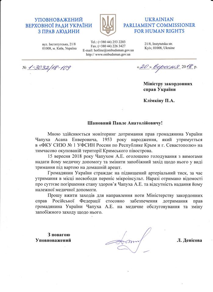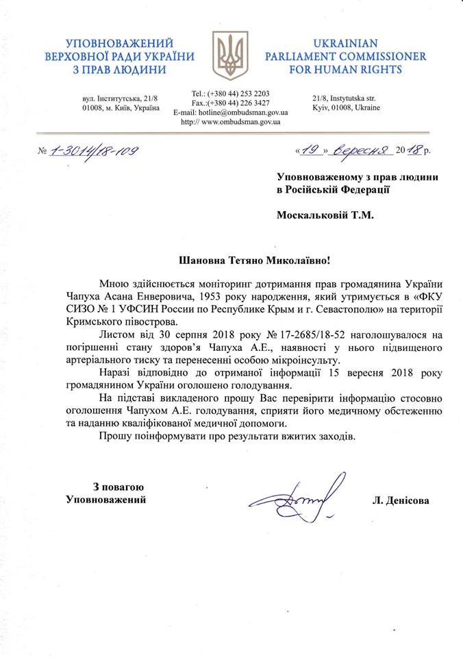 Денисова также сообщила, что отправила письмо омбудсмену РФ Татьяне Москальковой и ждет справку о состоянии здоровья Чапуха, а также обоснований, почему ему не обеспечили надлежащие условия содержания. Уполномоченная ВР по правам человека также обратилась к министру иностранных дел Павлу Климкину, чтобы МИД отправил ноту России по этому поводу.