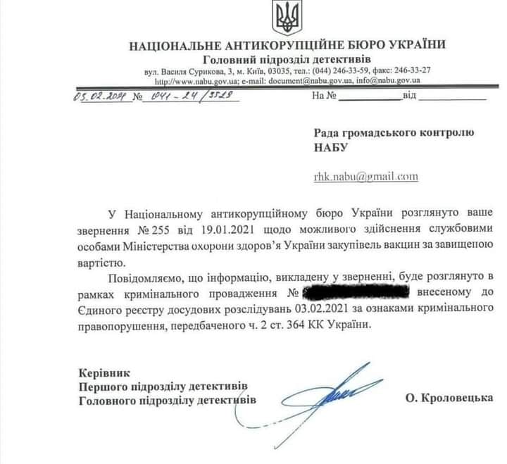 “НАБУ 3 февраля возбуждает дело, и в тот же день "Лекхим" просит перенести поставки вакцины Синовак из Китая. Это следует из текста письма, направленного НАБУ в Раду громадського контролю НАБУ”, - написал Истребин.